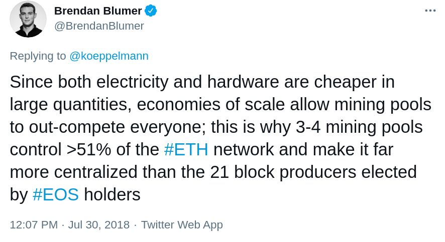 블록원(B1)의 CEO 브랜던 블루머(Brendan Blumer)는 "이오스 체인에 직접적인 영향"을 끼치기 위해 이오스 토큰을 구입하는 것이 얼마나 어려운 지에 대해 강조합니다. 그의 생각은 이오스 체인에 영향을 끼치는 것이 채굴을 위한 해쉬파워로 네트워크가 유지되는 POW(작업 증명) 체인에 영향을 끼치는 것보다 훨씬 어렵다고 말하는 것이며 이는 현재까지도 유효하게 여겨지고 있습니다. 이더리움 네트워크를 제어하기 위해서는 이더리움 해쉬파워의 가장 큰 비중을 차지하는 2-4개의 마이닝 풀에 대한 영향력만 획득하면 됩니다. 그러나 이오스에서는 체인을 제어하기 위해 15BP 이상에 대한 제어권을 획득해야 합니다.