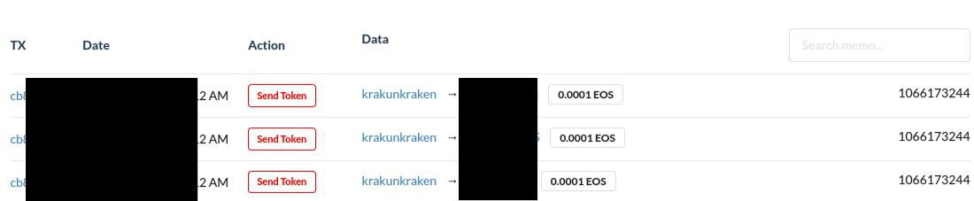 사기꾼들은 크라켄 거래소를 사칭하여 소량의 EOS 및 거래소 개인 식별 번호로 위장된 메모를 적어 임의의 이오스 계정에 전송합니다.