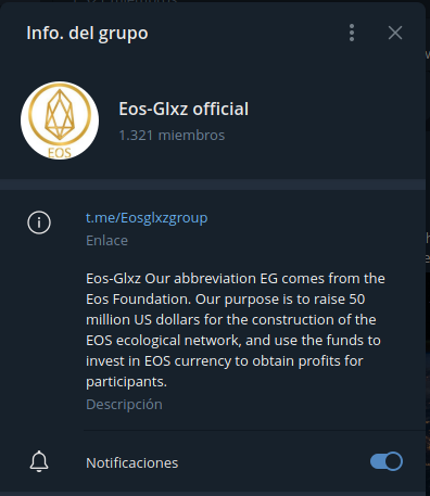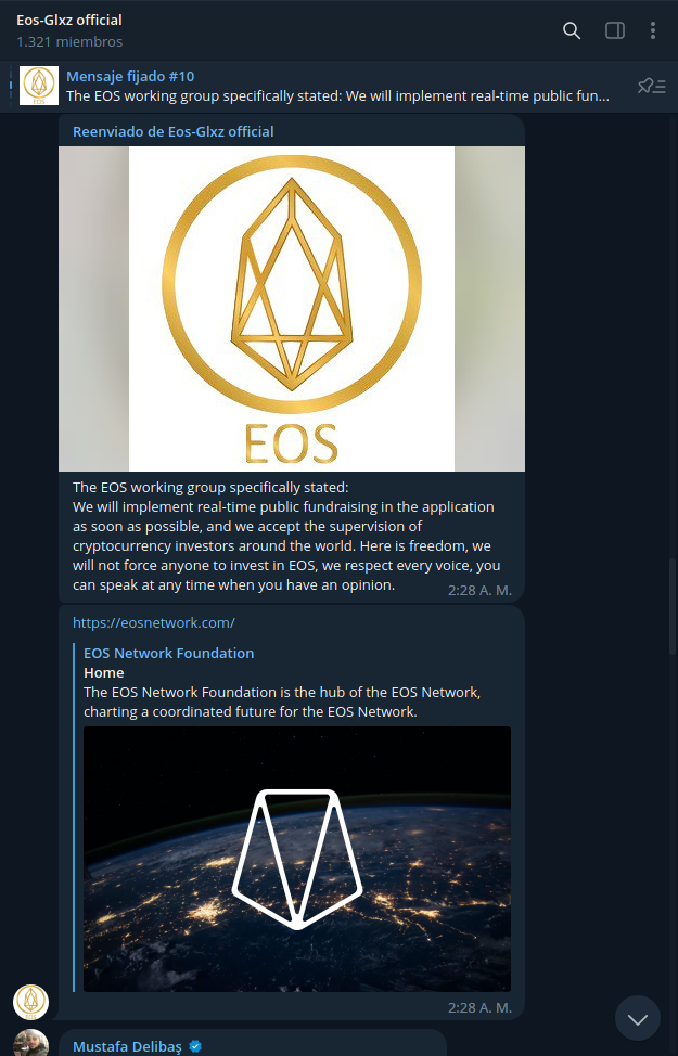 위 캡처 화면과 같이 이오스 네트워크 재단과 연관된 것처럼 가장한 텔레그램 그룹을 유의하세요. 그들은 가짜 이름, 그래픽 디자인과 내용을 무단으로 도용했습니다.