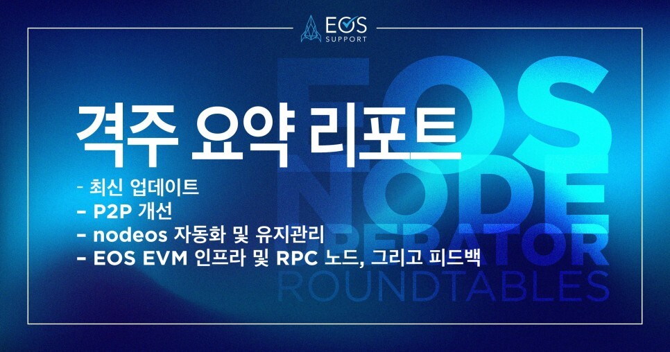 관련 경험을 공유하며 주요 논의가 시작되었습니다. 첫 번째 주제는 일반적인 노드 운영관련 유지보수, 관련 프로세스 및 소스 기반 빌드의 횟수를 묻는 것이었습니다. 다음으로 nodeos 자동화에 관한 논의가 이어졌습니다. 이후 P2P 개선사항에 대한 후속 조치를 다루며 회의는 마무리되었습니다.