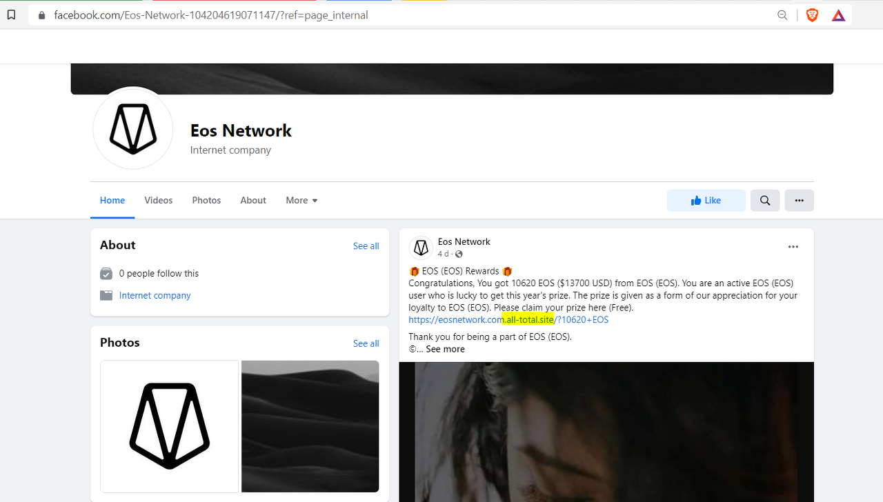 페이스북 사기 그룹의 경우 공식 도메인 eosnetwork.com을 "all-total.site"로 확장해 스캠 링크로 리디렉션 하고 있습니다. 이 페이스북 그룹의 링크를 클릭하지 마세요.