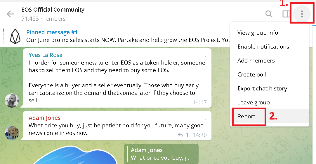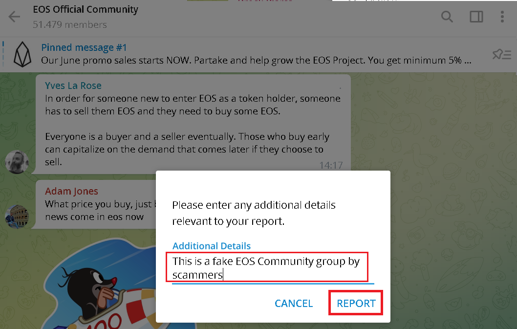 “This is a fake EOS Community group by scammers”를 입력하시고 “Report.”를 누릅니다.