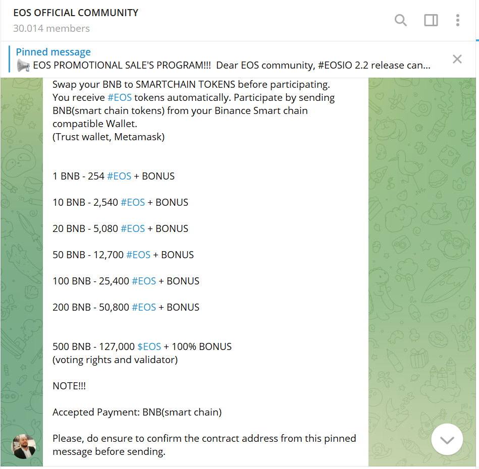 상기 언급한 두 번째 및 세 번째 텔레그램 스캠 그룹에서 사기꾼은 BNB를 해당 주소로 보내면 추가 EOS를 얻을 수 있을 것이라 말합니다. 이 주소로 BNB 토큰을 보내지 마세요! 귀하가 전송한 모든 자산을 잃게 됩니다.